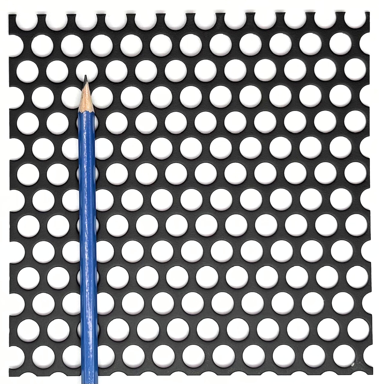 Mild steel round patterns are a very attractive option for both design and architectural purposes. Our round hole patterns can be used in millwork, railings, infills, privacy screens, and many other applications where cost effective panels are needed. Unlike our design perforated patterns (which vary from 16 to 22 gauge in thickness depending on the pattern), our mild steel round hole perforated patterns are only available in 16 gauge thick sheets for all hole diameters that we stock. Rite Way Fencing stocks hole diameters ranging from 1/8” to 1.00” in mild steel, much finer hole sizes with applications in filtration are available in our stainless steel catalog of round hole products. Please note that none of our mild steel material is finished with any sort of deterrent for rust, if this product is used outside without being finished it will rust and corrode over time. Powder coating and plating options are available for an additional charge, for more information about our finishing options please feel free to contact us .